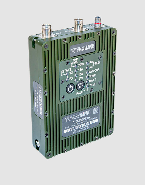 The problem is that standard 5-watt handheld military radios have a limited operating range of around eight to ten kilometres, depending on the ground and frequency they are operating on. Therefore, amplifiers (such as Ultralife’s A-320V3A, which can be seen at DSEI) can be attached to the radio to boost this distance by up to three times by increasing the wattage to 20.
