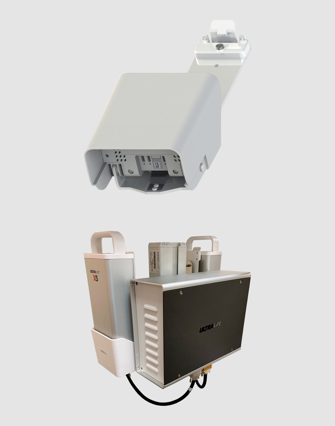 Both the X5-SuperLite and the X5 Power System have been designed to provide uninterruptible power. At any time during or after cart use, users can plug the power solutions into AC mains to charge the battery/batteries. When AC mains is unavailable or inconvenient, Ultralife has designed hold-up batteries for both the X5 Power System (as standard) and X5-SuperLite (optional) that can provide up to five minutes of power.